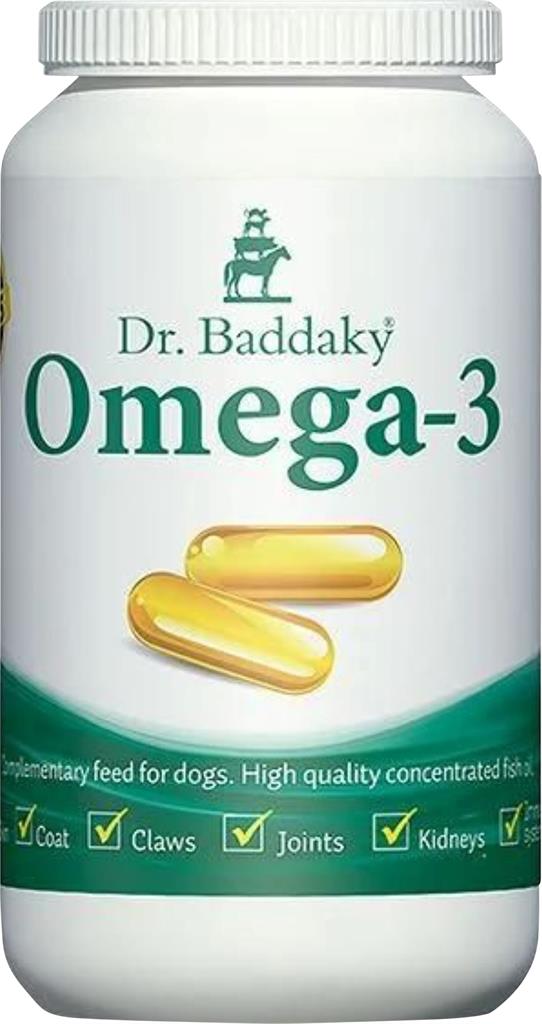 Dr. Baddaky Omega-3 fiskolja och kapslar av hög kvalité samt med högt innehåll av fettsyrorna EPA (Eikosapentaensyra) och DHA (Dokosahexaensyra) till hund, katt och häst. Regelbundet tillskott av Omega-3 har positiv effekt på hud och päls, hovar och klor, leder, njurfunktion, immunsystem, mage-tarmkanal, hjärt-kärl-systemet, reproduktion samt kognitiva funktioner.  Dr. Baddaky Omega-3 produceras i Norge. Vår fiskolja kommer från små fiskar som sill och ansjovis från Stilla Havet utanför Sydamerika. Vi tar inga genvägar när det gäller kvalitet. Fiskoljan kommer från hållbara fångster och är godkänd för mänsklig konsumtion. Dr. Baddaky Omega-3 produkter är helt spårbara ända ner till fiskebåten som fångade fisken. Oljan är certifierad av organisationen Friends of the Sea - certifierad hållbar fiskolja och uppfyller de strikta kraven från den norska läkemedelsmyndigheten (GMP-produktion), den europeiska farmakomp+en, den internationella globala organisationen för EPA och DHA Omega-3 (GOED Dr. Baddaky Omega-3 finns som olja och kapslar. Oljan kan blandas i djurets foder, kapslarna kan ges direkt genom munnen.     Den rekommenderade dagliga dosen av Dr. Baddaky Omega-3 är baserad på kliniska studier där Omega-3 fettsyror (EPA och DHA) användes som behandling för hundar, katter och hästar. Våra doseringsrekommendationer för hundar och katter är utformade för att ge 80-90 mg EPA + DHA per kg kroppsvikt och dag.   Exempel på beräkning av daglig dos för en hund med en kroppsvikt på 10 kg: 10 kg x 80-90 mg EPA +DHA/244 mg EPA + DHA per ml fiskolja =3,3-3,7 ml Omega-3 fiskolja eller 2 kapslar  Rekommenderad daglig dos för häst: 5,10 ml per 100 kg kroppsvikt. Den dagliga dosen kan ges som en enkel dos eller som flere doser fördelade över dagen.  För hundar och katter som har, eller har haft sjukdomar som kan påverka kroppens förmåga att smälta fett rekommenderar vi att du delar upp den dagliga rekommenderade dosen i flera mindre serveringer eller ger Dr. Baddaky Omega-3 kapsler. Öppnad förpackning förvaras i kylskåp och bör förbrukas inom 3 månader. OK för gravida och ammande: Ja Ingredienser:Sammansättning: Fiskolja, gelatin, glycerol Tillsatser: Tokoferol (Vitamin E) 8,2 mg/ml