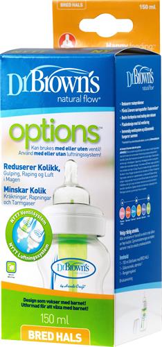Dr Browns nappflaska med bred hals Options motverkar kolik och mellanöroninflammation. Samma tryck inuti flaskan som utanför, gör det lättare för barnet att få i sig efter hur mycket barnet suger. Det bildas inget undertryck i mellanörat, som vid konventionella flaskor. Detta motverkar öronproblem. Dr Browns nappflaska med bred hals Options finns i två storlekar, 150ml och 270ml. Dinapp 1 medföljer.