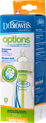 Dr Browns nappflaska med bred hals Options motverkar kolik och mellanöroninflammation. Samma tryck inuti flaskan som utanför, gör det lättare för barnet att få i sig efter hur mycket barnet suger. Det bildas inget undertryck i mellanörat, som vid konventionella flaskor. Detta motverkar öronproblem. Dr Browns nappflaska med bred hals Options finns i två storlekar, 150ml och 270ml. Dinapp 1 medföljer.