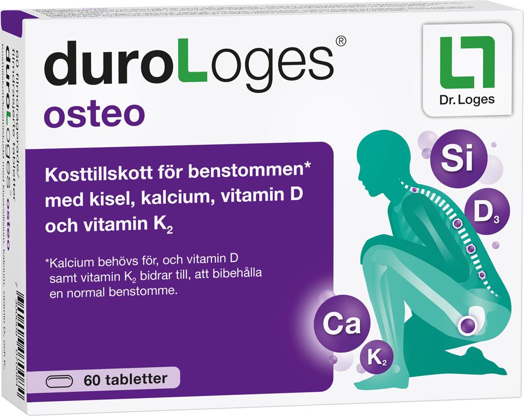 DuroLoges Osteo från Dr. Loges är ett kosttillskott med kalcium, D-vitamin, K2-vitamin och kisel. Kalcium bidrar till att bibehålla normal benstomme. Vitamin D bidrar till normalt upptag av kalcium, till normala kalciumnivåer i blodet samt till att bibehålla normal benstomme. Även Vitamin K bidrar till att bibehålla normal benstomme. Kosttillskott ersätter inte en varierad kost utan bör kombineras med en mångsidig och varierad kost samt en hälsosam livsstil.