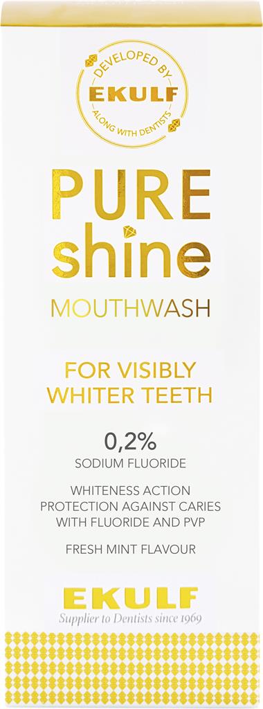 PURE shine munskölj använder en speciell kombination av ingredienser, bl.a. PVP (Polyvinylpyrrolidone), som motverkar beläggningar/plack på tänderna och håller tandytan ren. På så sätt hjälper produkten till att bibehålla tändernas naturliga vita färg. Den höga fluoridhalten (0,2% NaF) bidrar till att remineralisera både emalj och rotyta och motverkar såväl karies som dentala erosioner/frätskador. PURE shine munskölj har god mintsmak som ger en frisk andedräkt.