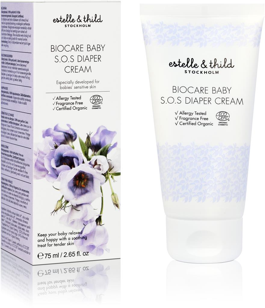 Estelle & Thild Biocare Baby S.O.S Diaper Cream är en blöjkräm som lindrar blöjeksem och irriterad hud med en lugnande blandning av ekologiskt certifierade ingredienser. Mjukgörande ekologisk mandelolja vårdar ditt barns känsliga hud samtidigt som rodnad och hudirritation förebyggs. Bivax skyddar extra känslig hud och bildar en naturlig barriär för maximal komfort. Oparfymerad.   100 % av ingredienserna är av naturligt ursprung. 69 % av ingredienserna är ekologiskt odlade. Produkten är certifierad av ECO CERT.   Innehåll: aqua, helianthus annuus hybrid oil, zinc oxide, prunus amygdalus dulcis oil, cera alba, tribehenin, butyrospermum parkii butter, hydrolyzed jojoba esters, jojoba esters, simmondsia chinensis seed oil