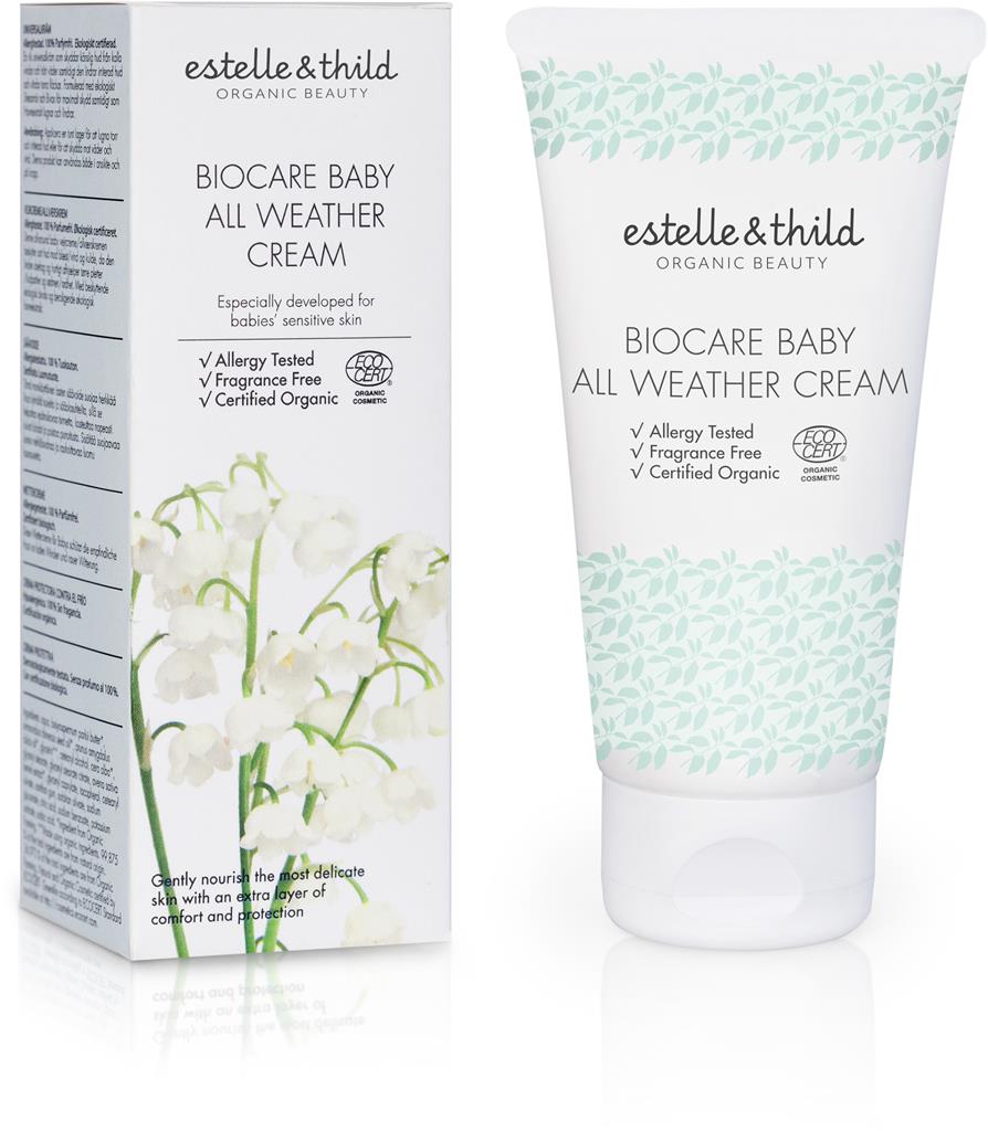 Estelle & Thild Biocare Baby All Weather Cream är en rik universalkräm som skyddar känslig hud från kalla vindar och hårt väder samtidigt den lindrar irriterad hud och vårdar torra fläckar. Formulerad med ekologiskt sheasmör och bivax för maximalt skydd samtidigt som havreextrakt lugnar och lindrar. Oparfymerad.   99,9 % av ingredienserna är av naturligt ursprung. 36,9 % av ingredienserna är ekologiskt odlade. Produkten är certifierad av ECO CERT.   Innehåll: Aqua, Butyrospermum Parkii Butter*, Simmondsia Chinensis Seed Oil*, Prunus Amygdalus Dulcis Oil*, Glycerin**, Cetearyl Alcohol, Cera Alba*, Glyceryl Stearate, Glyceryl Stearate Citrate, Avena Sativa Kernel Extract*, Glyceryl Caprylate, Tocopherol, Cetearyl Olivate, Xanthan Gum, Sorbitan Olivate, Sodium Gluconate, Citric Acid, Sodium Benzoate, Potassium Sorbate, Sorbic Acid   * Ingrediens från ekologisk odling **Tillverkad av ekologiska ingredienser