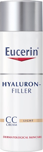 Eucerin Hyaluron-Filler CC Cream Light är en färgkorrigerande anti-age creme som stimulerar hudens egen produktion av Hyaluronsyra och fyller ut även djupa rynkor. Låg och högmolekylär Hyaluronsyra verkar i de övre och undre hudlagren i överhuden där fina respektive djupare rynkor bildas. Glycine Saponin stödjer produktionen av Hyaluronsyra i cellerna där de djupaste rynkorna bildas. Tillsatta färgpigment smälter in i huden och korrigerar hudtonen för ett jämnt, naturligt och strålande resultat.