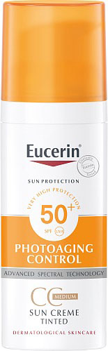 Eucerin Sun Protection Photoaging Control Sun Cream Tined SPF50+, en tonad solcreme för ansiktet med mycket högt skydd och Anti-age effekt. Solcremen ger en jämnare hudton samtidigt som den förebygger förtida åldrande av huden och minskar synliga tecken på åldrande. Konsistensen är lätt och absorberas snabbt. Lämplig för alla hudtyper, även känslig hud. Utan parfym.