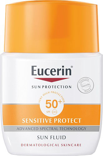 Eucerin Sensitive Protect Sun Fluid SPF50+, en mattgörande solskyddscreme för ansiktet med mycket högt skydd som skyddar normal och känslig, blandad samt fet hud från solinducerade hudskador. Konsistensen är lätt och absorberas snabbt. Cremen innehåller en combination av UVA/UVB-filter för ett mycket högt UV-skydd och Licochalcone A som hjälper till att neutralisera fria radikaler. Formulan med Glycyrrhetinic Acid stödjer hudens förnyelseprocess. Kliniska och dermatologiska studier visar: mycket god hudvänlighet på känslig hud. Även lämplig på aknebenägen hud. Vattenresistent. Utan parfym.