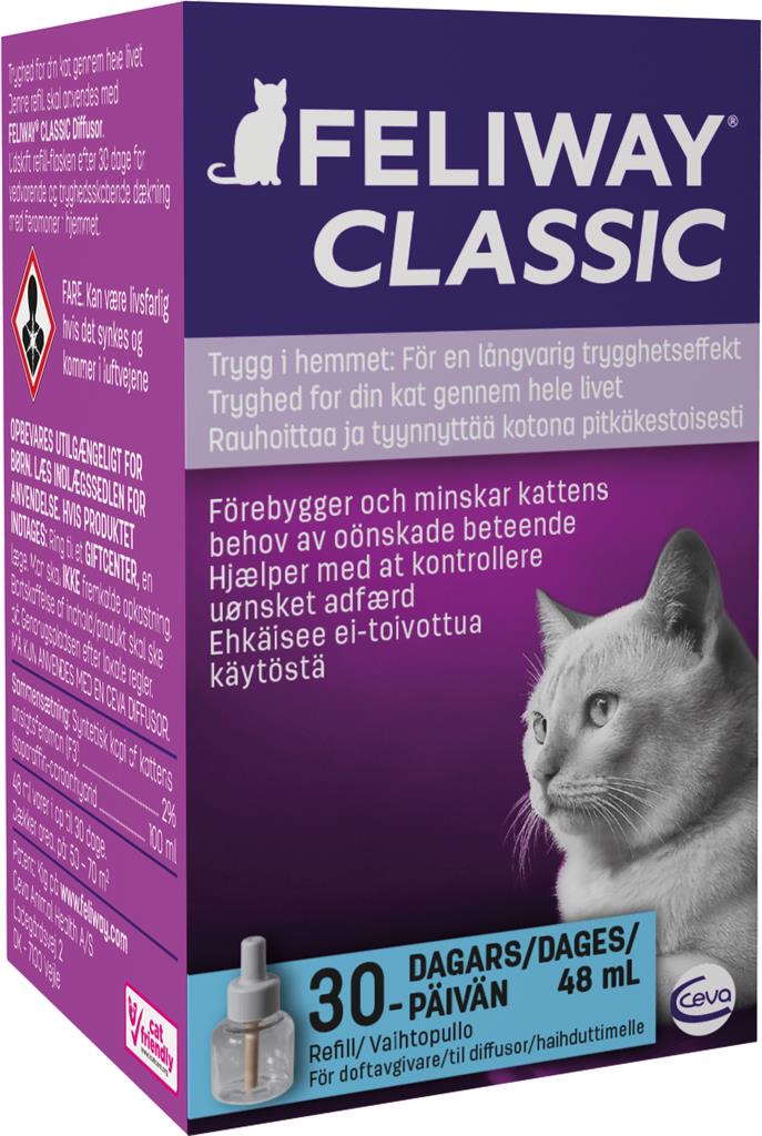 Feliway Classic Refill är en lösning som används med Feliway Classic Doftsavgivare. Användning    • Refillförpackning (48 ml) till Feliway Classic. • 1 refill varar i cirka 4 veckor. • Följ anvisningarna på produkten/bruksanvisningen.
