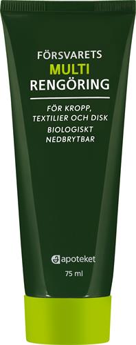 Försvarets Multirengöring är en parfymfri rengöringsgel som är mild och skonsam för hud och händer. Produkten rengör kroppen samtidigt som den kan användas för textilier, disk och annan tvätt. Den fungerar både i söt- och saltvatten samt är biologiskt nedbrytbar. En multifunktionell rengöringsprodukt som passar utmärkt på resan och vid friluftsaktiviteter. Innehåller inga ingredienser av animaliskt ursprung.