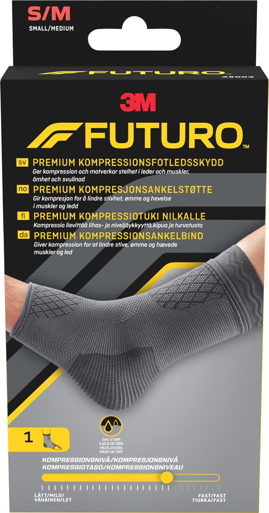 Futuro kompressionsfotledsskydd är ett slip‑on‑skydd som används för att ge stöd vid mild tendinit, svullnad, ömhet, stukningar och sträckningar i fotleden. Skyddet är utformat för att kunna användas av både kvinnor och män och passar för daglig användning. Materialet är mjukt, ventilerande och fuktavledande med fyrvägsstretch.