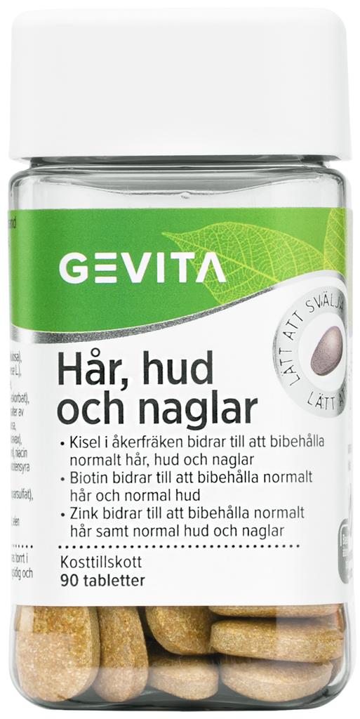 Gevita Hår Hud Naglar används som ett dagligt tillskott för hår, hud och naglar. Tabletten har en unik mandelform som underlättar sväljandet av tabletten. Innehåller kisel från åkerfräkenpulver som bidrar till att bibehålla normalt hår, hud och naglar. Zink bidrar till att bibehålla normalt hår, hud och naglar. Biotin bidrar till att bibehålla normalt hår och hud. Innehåller även öljäst, B-vitaminer och mineraler. Kosttillskott ersätter inte en varierad kost utan bör kombineras med en mångsidig och varierad kost samt en hälsosam livsstil.