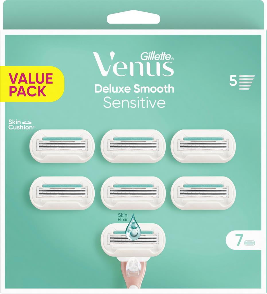 Venus rakblad är utformade för kvinnliga former. Venus Deluxe Smooth Sensitive rakhyvlar för kvinnor är perfekta för att skydda din känsliga hud. Rakbladsrefillerna har 5 blad för en slät rakning som varar längre och SkinElixir som ger ifrån sig en perfekt dos av skydd du kan känna. Samtliga Venus-rakblad passar alla Venus-handtag (Förutom Simply Venus och Venus Pubic Hair and Skin).