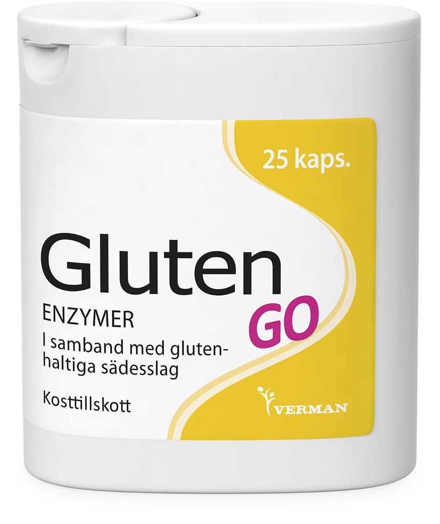 Gluten GO är ett kosttillskott som innehåller en kombination av tre noggrant utvalda matsmältningsenzymer som spjälkar gluten i spannmål lämplig för glutenkänsliga. Tas i samband med intag av glutenhaltig mat och ger en större frihet till att kunna äta efter önskemål. Gluten GO ger snabb effekt och kommer i en liten och smidig förpackning som är enkel att ta med sig. Kan hjälpa till att motverka magbesvär som gaser i magen, svullen mage och uppblåsthet. Lämpar sig inte för personer med celiaki. Produkten är vegansk. Kosttillskott ersätter inte en varierad kost utan bör kombineras med en mångsidig och varierad kost samt en hälsosam livsstil.