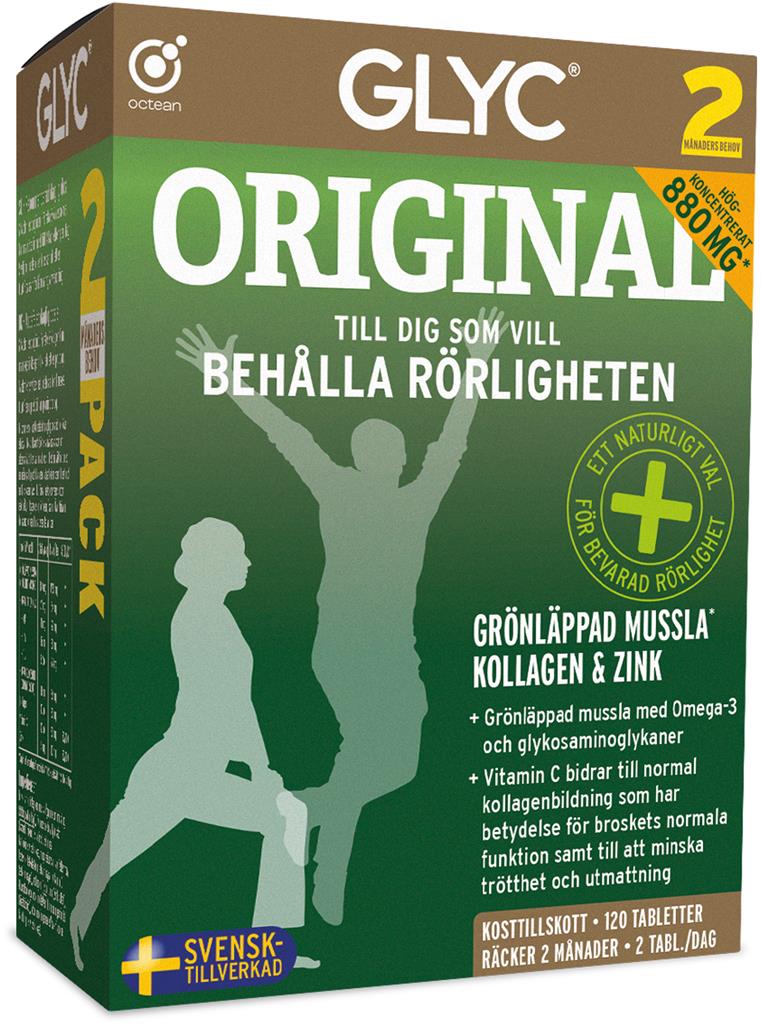GLYC ORIGINAL är ett svensktillverkat kosttillskott som hjälper till att bibehålla rörliga, hälsosamma leder så att vardagsmotionen kan utökas. Det är utformat för dig med artros och ledbesvär. Bidrar till smidighet av finmotoriken framför allt i fingrar, fötter och knän hos de som har besvär eller vill förebygga. Detta kosttillskott från GLYC ORIGINAL är nypon tabletter med ett innehåll av grönläppad mussla och gurkmeja. Kosttillskottet innehåller också vitamin C och zink. Gurkmeja främjar ledernas rörlighet och Vitamin C främjar kollagenbildningen, samtidigt som det bidrar till minskad trötthet och utmattning. Zink bidrar till normal benstomme.