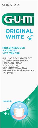 GUM Original White är en tandkräm som med en skonsam formula stärker emaljen och ger skydd mot karies. Tandkrämen innehåller mikroniserade rengöringspartiklar av hydrerad silica för att avlägsna missfärgningar utan starka slipmedel. Tandkrämens unika substans Stain Clear penetrerar missfärgningar och löser varsamt upp dem, även i ojämnheter på emaljen utan starka blekningssubstanser. Det höga fluorinnehållet både stärker och skyddar emaljen.