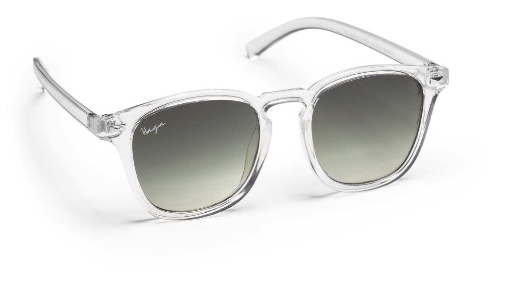 Haga Eyewears solglasögon är CE-märkta, har 100% procent UV-skydd, ett UV 400 filter och är nickelbehandlade. Copenhagen Transparent är en unisex-modell med en grå lins.