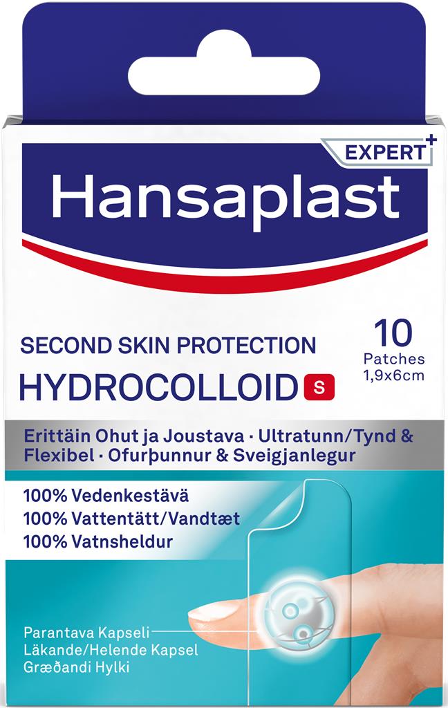 Hansaplast Hydrocolloid fingerplåster S är ett ultratunt och flexibelt hydrokolloidplåster som fungerar som ett andra hudlager. Plåstrets hydrokolloidteknik absorberar sårvätska och bidrar till att bevara en fuktig sårläkningsmiljö och bilda en läkande kapsel över såret. Detta kan påskynda sårläkningen och minska risken för ärrbildning. Det är utformat för att sitta kvar i flera dagar och har extra stark vidhäftning för skydd i över 72 timmar.