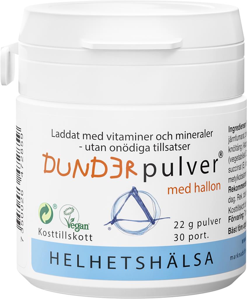 Helhetshälsa Dunderpulver® barnvitamin är ett kosttillskott för barn. Kosttillskottet är sockerfritt vitamin- och mineraltillskott för barn i pulverform som enkelt kan blandas i mat och dryck, till exempel i frukostflingorna eller smoothies. Barnvitaminet innehåller 12 vitaminer och 5 mineraler som alla bidrar till kroppens normala funktioner. Dunerpulver innehåller bland annat järn, zink och jod som bidrar till normal kognitiv funktion. Selen, folsyra, järn, vitamin B6, B12, C och D bidrar till immunsystemets normala funktion. Vitamin D och magnesium bidrar till att bibehålla normal benstomme och normala tänder.