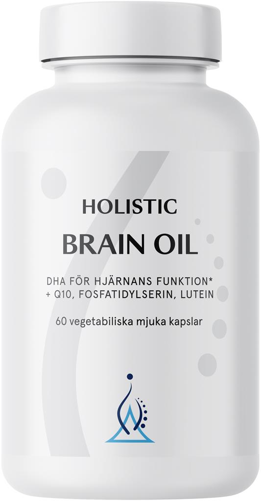 Holistic Brain Oil är ett kosttillskott med DHA (docosahexaensyra) från mikroalgen Schizochytrium sp., kombinerat med koenzym Q10, fosfatidylserin och lutein. DHA är en omega-3-fettsyra som ingår i cellmembran i hjärnan och ögonen. DHA bidrar till att bibehålla normal hjärnfunktion och normal synförmåga, där gynnsam effekt uppnås vid ett dagligt intag av 250 mg DHA.
