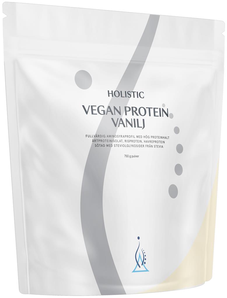 Holistic Vegan är ett växtbaserat proteinpulver som innehåller protein från ärta, ris och havre. Protein bidrar till att öka och bibehålla muskelmassa samt till att bibehålla normal benstomme. Produkten innehåller alla nio essentiella aminosyror, inklusive grenade aminosyror (BCAA). Varje portion ger 25,5 g protein och har låg sockerhalt. Pulvret är avsett att blandas i vätska och kan användas som ett komplement till den dagliga kosten.