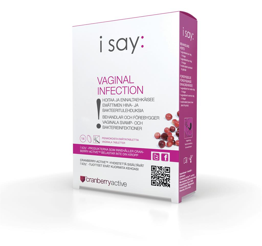 i say: Vaginal Infektion är en medicinteknisk produkt klass II som kan behandla och förebygga infektioner och där tillhörande besvär i slidan. I SAY: Vaginal Infektion innehåller Cranberry-Active™, ett tranbärsextrakt från hela tranbär. De små vaginaltabletterna kan behandla infektioner som förorsakas av bakterier och jästsvampar, eliminerar där tillhörande besvär och förhindrar att nya infektioner uppstår. I say: vaginaltabletter kan behandla både svampar såväl som vaginos i slidan och återställer normalt pH i slidan. Vaginaltabletterna kan användas mot obehag i underlivet såsom flytning, klåda, brännande känsla eller lukt. Produkten innehåller ett hög koncentrerat extrakt av tranbär, som återställer normalt, vaginalt pH. Du kan också använda tabletterna året runt i ett förebyggande syfte t.ex. då immunförsvaret i perioder kan vara nedsatt, om du är stressad eller får antibiotikabehandling. Användning: ·         I say: vaginaltabletter kan användas av vuxna och unga kvinnor från 16 år. Bör inte användas under graviditet, amning och av barn under 16 år utan läkares ordination. ·         Produkten kan användas under menstruation. ·         Det rekommenderas att använda vaginaltabletten strax före sänggåendet. Vaginaltabletten placeras djupt in i slidan. Innehåll: Cranberry- ActiveTM, Lactitol monohydrate, Hyaluronsyra, Polyethylenglycol 6000, Crospovidon (PVP), Magnesiumstearat, Citronsyra