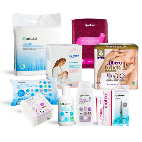 När du köper Apotekets Komma-hem-paket får du rabatt och fri frakt. Paketet innehåller produkter för första tiden för bebisen och den nyblivna mamman
