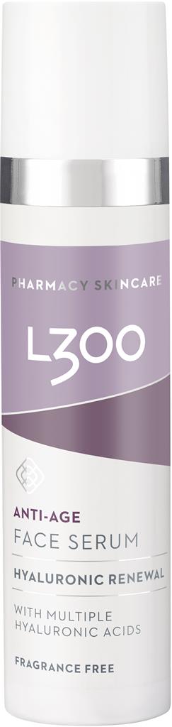 L300 Hyaluronic Renewal Anti-Age Face Serum är ett fuktgivande ansiktsserum som innehåller hyaluronsyror som jobbar på olika sätt i huden för att ge fukt, fasthet och ett direkt lyft. Även hudens egen förmåga att producera och behålla hyaluronsyra stimuleras. Serumet ger en direkt fuktboost och långsiktigt en återfuktad, fastare och slätare hud.