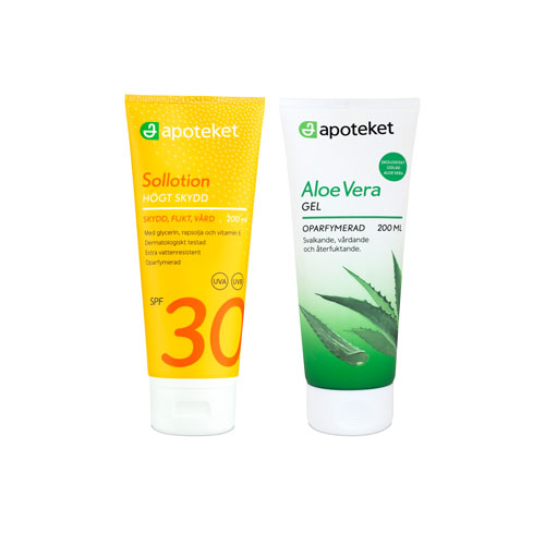Med sollotion och gel i väskan är du alltid redo om solen tittar fram på lunchen, kafferasten eller resan. Vår oparfymerade sollotion skyddar mot UVA/UVB-strålar, är lätt att stryka på och går snabbt in i huden. Aloe Vera gel svalkar, återfuktar och kan användas på hela kroppen.