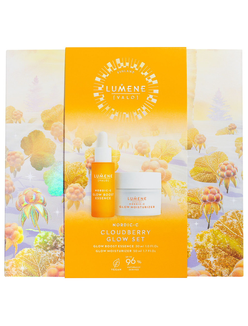 Cloudberry Glow Set presentförpackning med lystergivande serum och dagkräm.
