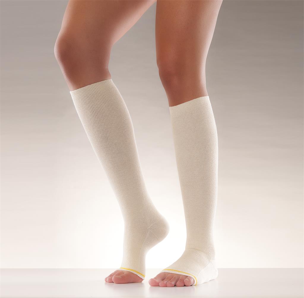 Förbands-/antitrombosstrumpan är en naturfärgad knästrumpa UTAN TÅ som ger ett kompressionstryck på ca 18 mm Hg vid ankeln.