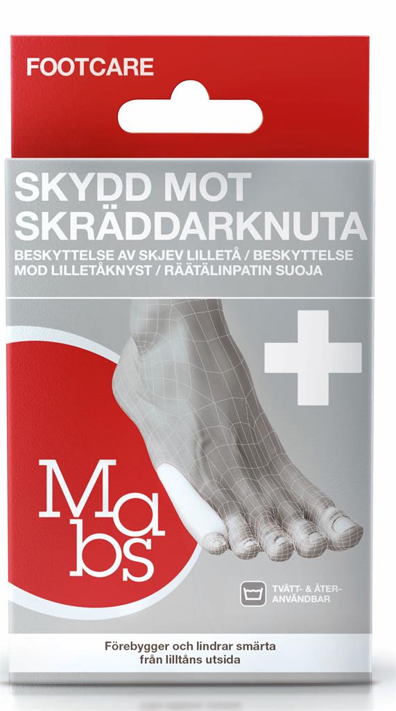Skräddarknuta kallas det när man får en utbuktning på lilltåns utsida ofta till följd av pronering. Utsidan av foten tvingas då utåt och rodnad och smärta uppkommer. Mabs Skydd mot Skräddarknuta är tillverkad i ren gelé och utformad så att gelé-ringen i änden på skyddet träs över lilltån, gelékappan hamnar då över den utbuktande delen av lilltåns utsida och bildar ett tryckavlastande hölje som lindrar smärta och motverkar förhårdnader. Produkten är tvättbar.