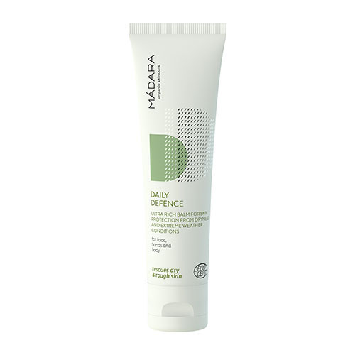 Mádara Daily Defence Ultra Rich Balm är en klimatkräm för hela kroppen som motverkar torr och grov hud, samt skyddar huden mot kraftiga vindar och kyla. Kan användas partiellt på tex kinder, näsa, armbågar, händer och fötter.