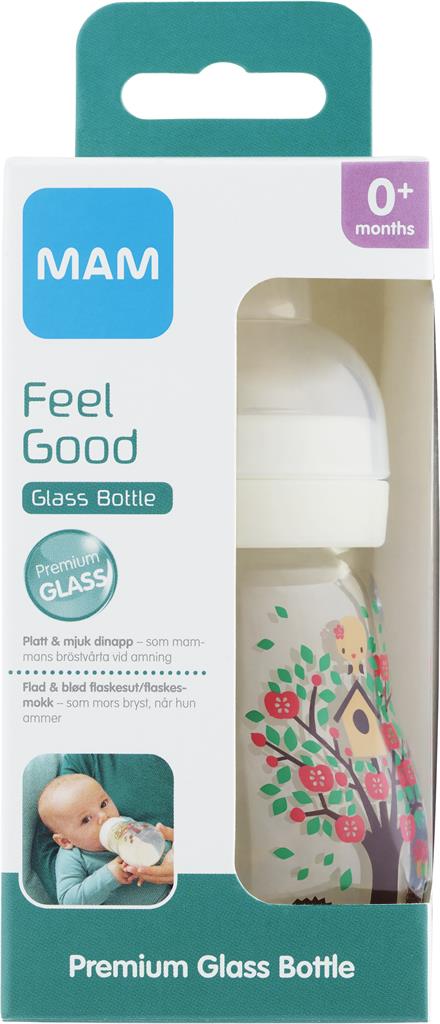 MAM Feel Good är en greppvänlig nappflaska i premiumglas med hög temperaturtålighet. Flaskan har en praktisk graderad skala för noggrann mätning, vid hals för enkel fyllning och rengöring, samt ett läckagesäkert lock som även kan användas som mått. Perfekt för bröstmjölk och bröstmjölksersättning. Medföljer gör MAM Teat dinapp 1 med silkeslen silikon, MAM SkinSoft, för en naturlig känsla.