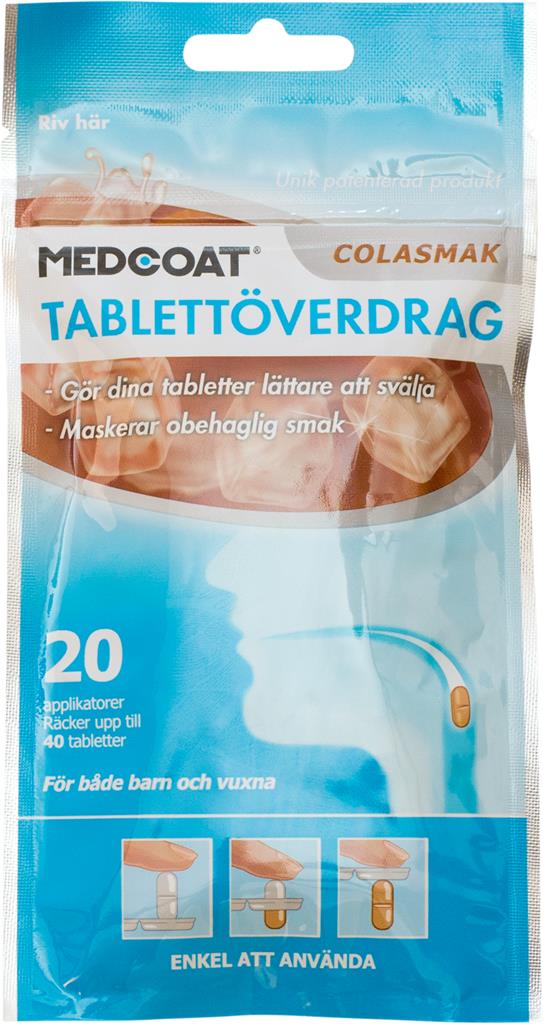 Medcoat är ett glidfritt överdrag som gör det enklare att svälja tabletter och kapslar. Överdraget har en len och hal yta, vilket minskar friktionen i munnen och halsen. Dessutom har Medcoat en mild, behaglig smak av cola som döljer eventuell obehaglig smak från läkemedlet.