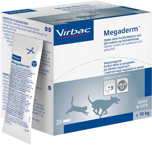 Megaderm är ett välsmakande kompletteringsfoder med essentiella fettsyror till hundar och katter med känslig hud eller med dålig pälskvalité. Hjälper till att stärka hudbarriären och förbättra pälskvalitén. Innehåller högkoncentrerade Omega-6 och Omega-3 fettsyror i förhållandet 5:1, samt vitamin E. Megaderm gelen är förpackad i lufttäta endosförpackningar för att förhindra oxidation och bevara innehållets skyddande egenskaper.