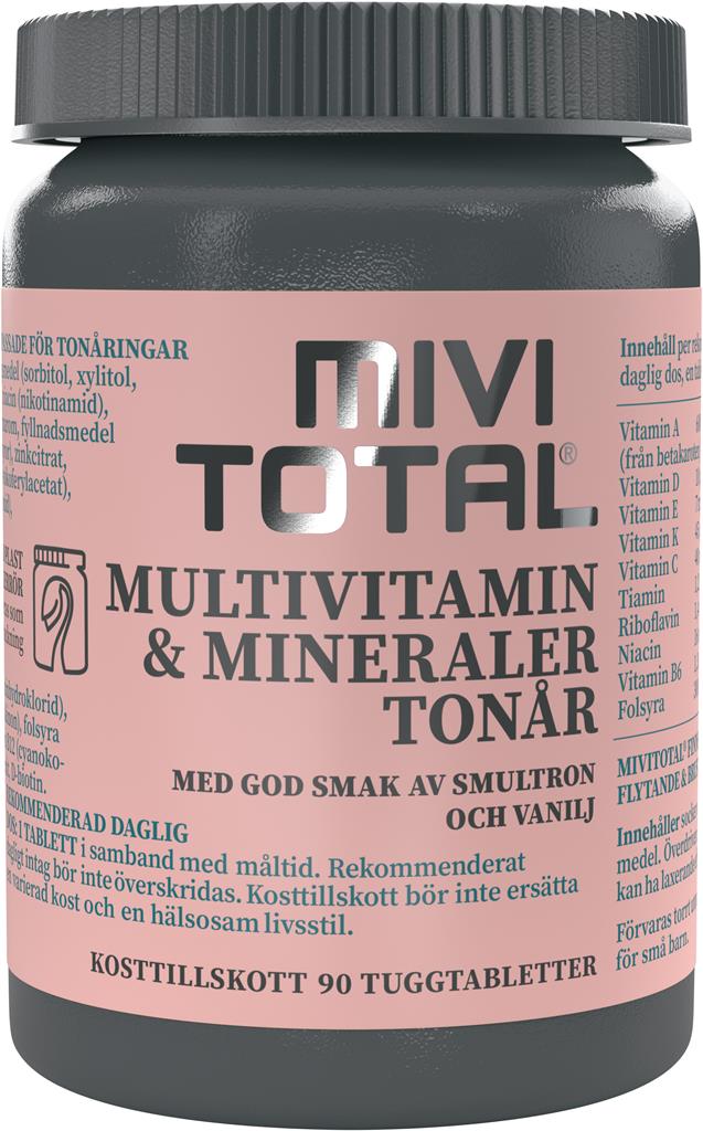 Mivitotal® Tonår är ett kosttillskott som innehåller vitaminer och mineraler anpassad för ungdomar över 13 år. Mivitotal Tonår tuggtablett är med god smak av smultron och vanilj. Innehåller bland annat niacin, pantotensyra, B6-vitamin, folsyra, B12-vitamin och järn som bidrar till att minska trötthet och utmattning. D-vitamin för immunsystemets normala funktion. Jod och Zink bidrar till normal kognitiv funktion. Niacin bidrar till normal psykologisk funktion och att bibehålla normal hud.