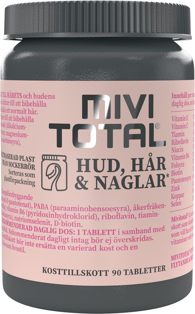 Mivitotal® Hud, Hår & Naglar är ett kosttillskott som innehåller vitaminer och mineraler speciellt utvecklat för hud, hår och naglar. Kosttillskottet innehåller bland annat koppar som bidrar till hårets och hudens normala pigmentering. Zink och selen bidrar till att bibehålla normala naglar. Biotin hjälper till att bibehålla ett normalt hår. Riboflavin, biotin, niacin och zink bidrar till att bibehålla normal hud.