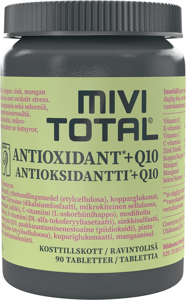 Mivitotal Vitaminer Antioxidant är ett kosttillskott som innehåller vitamin C, vitamin E, koppar, zink, mangan och selen som bidrar till att skydda cellerna mot oxidativ stress. Innehåller även Q10.