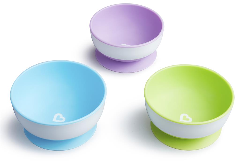 3-pack skålar i olika storlekar med stark sugpropps-botten som förhindrar spill och kladd.