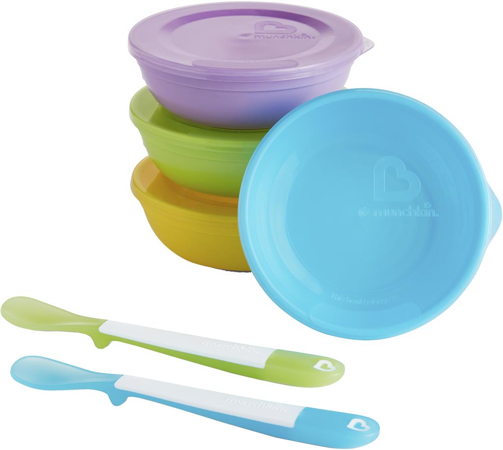 2 skedar & 4-pack med stapelbara burkar. Varje burk har tättförslutande lock och kan användas både i micron och i frysen