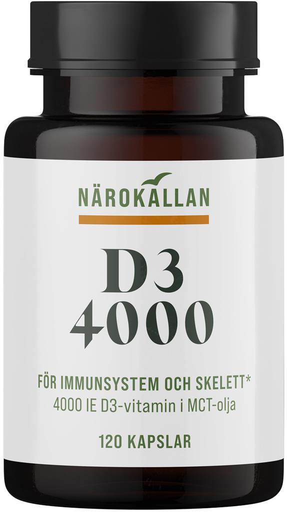 D3 4000 IE från Närokällan innehåller vitamin D3 (kolekalciferol). D-vitamin är ett fettlösligt vitamin och kapslarna innehåller därför MCT‑olja från kokosnöt. Vitamin D bidrar till immunsystemets normala funktion samt till att bibehålla normal benstomme. Produkten tas som ett komplement till kosten.