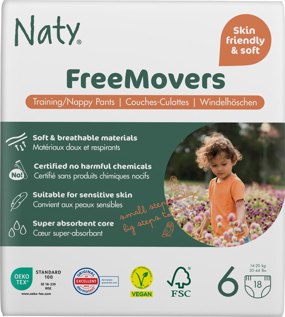 Naty FreeMovers i storlek 6 är utformad för barn med en vikt på cirka 16–20 kg. Byxblöjorna är tillverkade av mjuka, andningsbara och hudvänliga material som ger hög komfort vid användning. De har en absorberande kärna med FSC‑certifierad cellulosa som bidrar till ett pålitligt läckageskydd både dag och natt. En praktisk våtindikator visar när det är dags att byta blöja. Produkten är certifierad enligt Oeko‑Tex Standard 100.