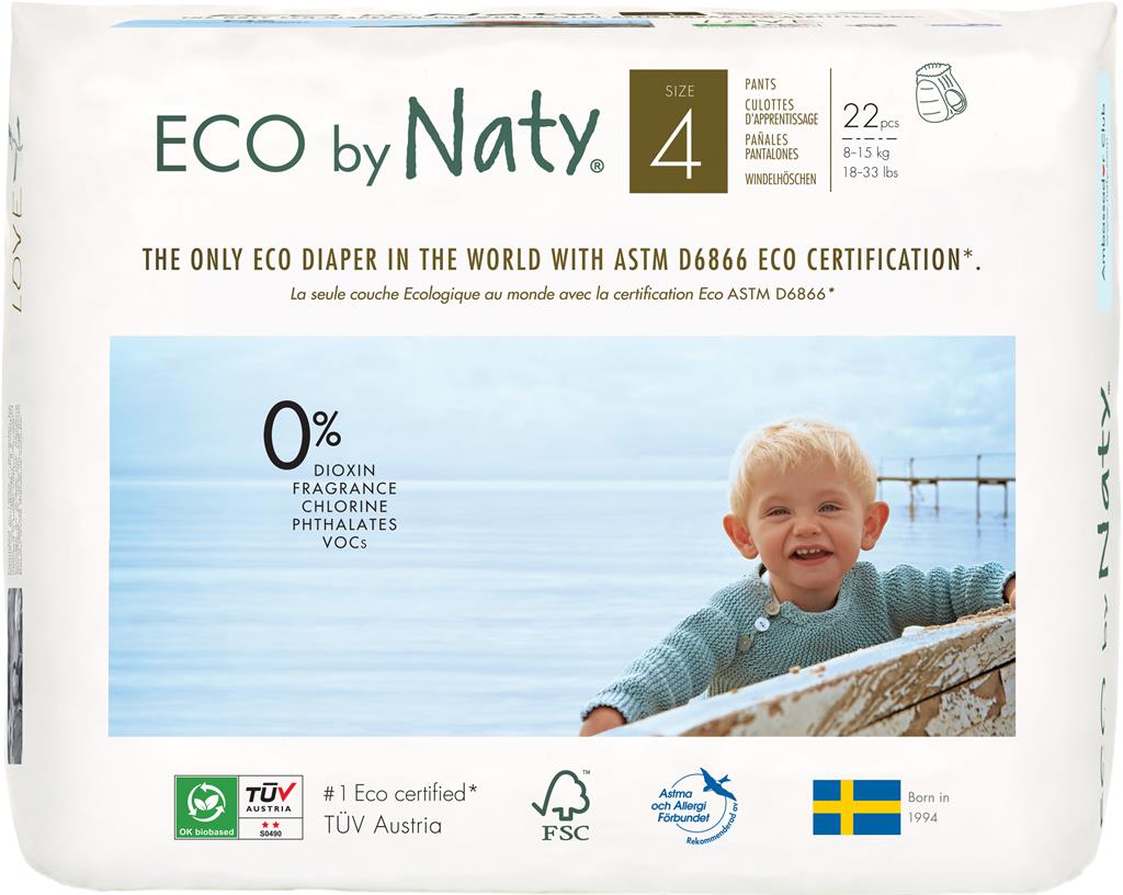 När barnet utforskar världen på darriga ben är det dags att byta till ekologiska byxblöjor storlek 4 från Naty. Se fram mot samma egenskaper och komfort som Natys vanliga ekoblöja, men med elastiska perforerade sidor och ben som gör blöjbytet till en barnlek. De många åren av utveckling av ekologiska engångsblöjor gör att användningen av biologiskt nedbrytbara material är större än någonsin, men med samma egenskaper och komfort med tunn och smidig passform.