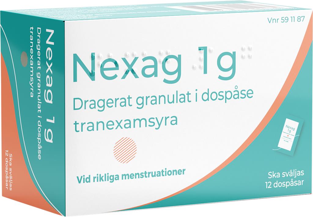Nexag® innehåller tranexamsyra och används för att minska rikliga menstruationsblödningar hos personer med regelbunden menstruationscykel (21–35 dagar, där cykellängden inte varierar med mer än 3 dagar). Behandlingen ska endast användas vid pågående menstruation.