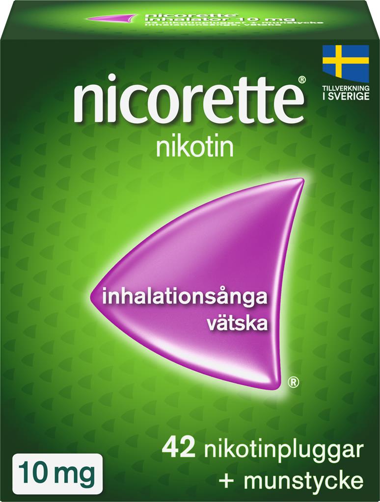 Nicorette är avsedd att hjälpa dig att sluta röka. Nicorette lindrar nikotinbegär och abstinensbesvär när du slutar röka. När kroppen plötsligt inte längre tillförs nikotin från tobak, uppstår olika obehag som kallas abstinensbesvär. Användning av Nicorette kan förhindra eller lindra sådana obehag och rökbegär genom att du fortsätter tillföra kroppen en liten mängd nikotin under en kort tidsperiod. Nicorette Inhalator består av en plugg som innehåller nikotin och smakämne. Nikotinpluggen sätts in i ett munstycke före användning. Nikotin förångas och tas upp via munhålans slemhinna när luft dras genom Nicorette Inhalator. Nicorette Inhalator ska helst användas tillsammans med ett rökavvänjningsprogram. Läs alltid bipacksedeln noga eller gå in på fass.se för mer information.