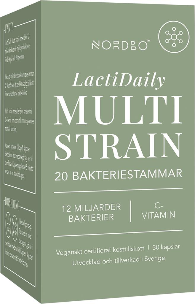 Nordbo LactiDaily Multi Strain är utvecklat för att främja en balanserad och diversifierad tarmflora. Varje kapsel innehåller 12 miljarder levande mjölksyrabakterier från 20 noggrant utvalda stammar. Produkten innehåller även syraneutral C-vitamin (kalciumaskorbat) som bidrar till immunsystemets normala funktion. Kapslarna är av typen DRcaps®, vilket skyddar bakterierna mot magsyra och gör att de frigörs först i tarmen.