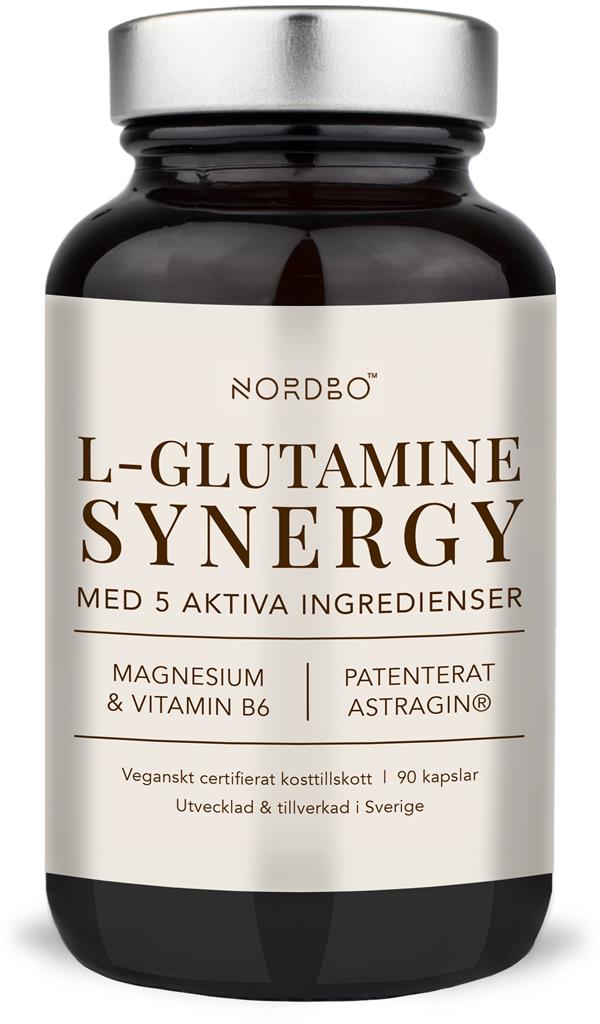 Nordbo L-Glutamine Synergy är ett synergistiskt kosttillskott som kombinerar aminosyran L-glutamin med magnesiumbisglycinat, Le Guérandais® havssalt, vitamin B6 och Astragin®. L-glutamin är den vanligast förekommande aminosyran i kroppen, bland annat i muskelvävnad och blod. Magnesiumbisglycinat är en form av magnesium med god biotillgänglighet och skonsamhet för magen. Produkten är veganskt certifierad och tillverkad i Sverige.