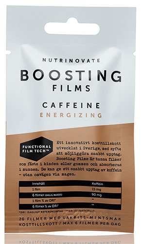 Nutrinovate Boosting Films Caffeine Energizing är ett innovativt kosttillskott utvecklat i Sverige, med syfte att möjliggöra snabbt upptag. Nutrinovate Boosting Films Caffeine Energizing är tunna filmer som fästs i kinden eller gommen och absorberas i munnen. De kan ge ett snabbt upptag av koffein - utan omvägen via magen. Koffein bidrar till ökad vakenhet och ökad koncentration.