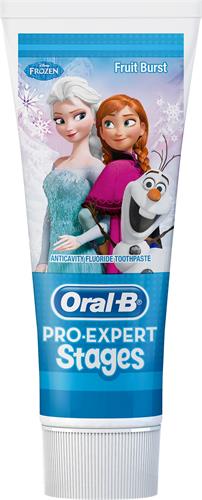Oral-B Pro-Expert Stages Frozen barntandkräm 75ml gör det roligt att borsta tänderna ordentligt - dessutom med en formula som avlägsnar plack och skyddar mot hål.   Använd den gärna tillsammans med den matchande eltandborsten och den interaktiva appen Disney Magic Timer från Oral-B för att hjälpa barnen att borsta sina tänder i de rekommenderade två minuterna.     -          Med en fluornivå anpassad för barns mjölktänder -          Kan bidra till att ge barnet en bra tandvårdsrutin     Bruksanvisning: Borsta dina barns tänder med Oral-B Frozen tandkräm minst 2 gånger dagligen.   Se även eltandborstrefill från OralB med samma Frozen-mönster.     Innehåll: Sorbitol, Aqua, Hydrated Silica, Sodium Lauryl Sulfate, Cellulose Gum, Aroma, Trisodium Phosphate, Sodium Phosphate, Sodium Saccharin, Carbomer, Sodium Fluoride, Limonene, Benzyl Alcohol, CI 42090 Oral-B grundades på 1950-talet i Kalifornien och erbjuder tandprodukter till konsumenter, tandspecialister och återförsäljare världen över.