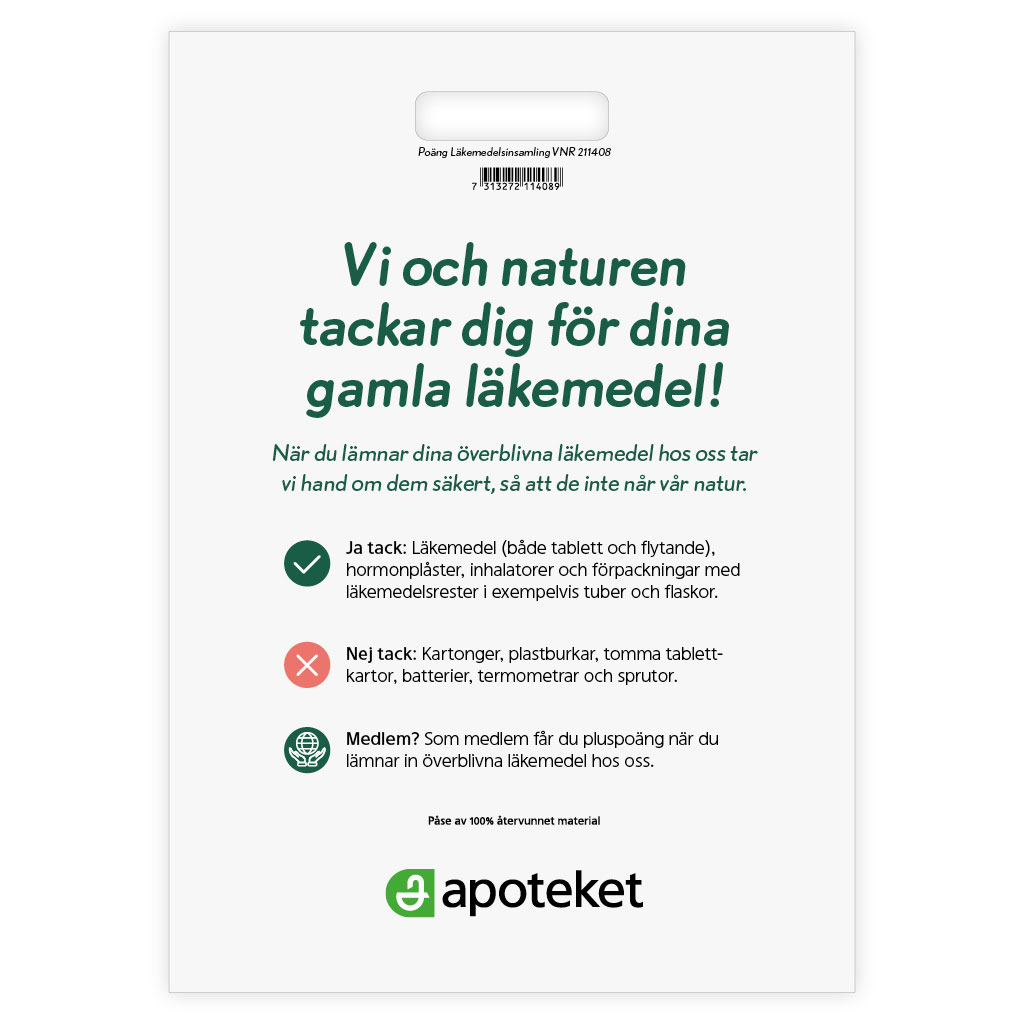 Apotekets påse för överblivna läkemedel är framtagen för detta ändamål men även en vanlig genomskinlig plastpåse går bra. Den genomskinliga påsen är till för att personalen ska se att det inte är något annat än läkemedel i påsen. I påsen kan du lägga både receptbelagda läkemedel och receptfria läkemedel. Det går bra att hälla ihop burkar med tabletter och kapslar samt tömma ur kartonger med tablettkartor i påsen, men du behöver inte trycka ut tabletterna från tablettkartorna. Ytterförpackningar källsorteras som alla andra förpackningar: papp, plast, glas och metall för sig. För farligt avfall, sprutor och kanyler gäller särskilda regler som kan variera mellan olika kommuner.