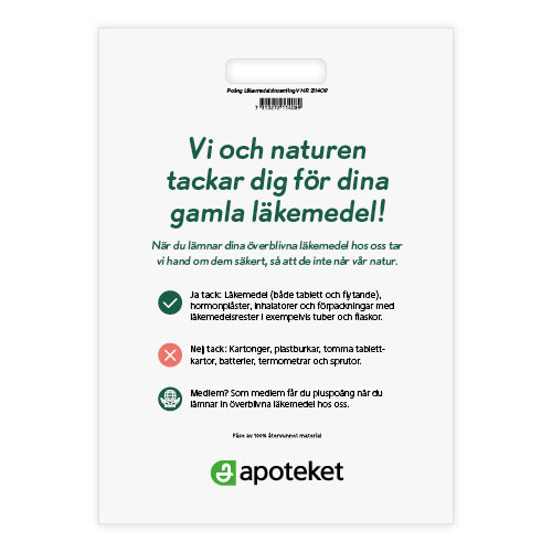 Samtidigt som läkemedel är livsnödvändiga kan både tillverkning och användning ha negativa effekter på miljön. Hjälp oss att minska miljöpåverkan genom att lämna in överblivna läkemedel. Läkemedel som lämnas in till Apoteket destrueras på ett säkert sätt för att hindra att miljöskadande substanser når ekosystemet.